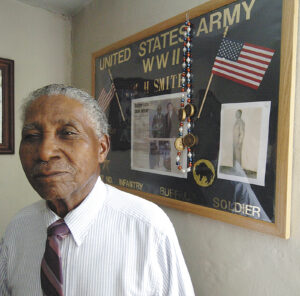 Jim Smith was a “Buffalo Soldier” of the African American 92nd Division during World War II. The origin of the legendary name “Buffalo Soldiers” which was coined by American Indians around the time of the civil war is murky. Some say when the American bison was wounded or cornered; it fought ferociously while displaying uncommon courage, identical to the black man in battle. Others say it was because the short black hair reminded the Indians of the coat of the buffalo. Buffalo Soldiers fought with distinction in WWII and all wars beginning with the Civil War.