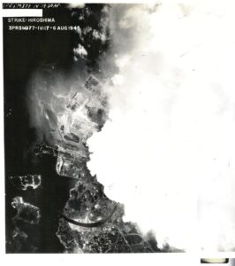 The flight on August 6, 1945, started routinely. Of course, there was no knowledge of the momentous event that was to take place that day. On August 6 – at 8:16 a.m. – McGlohon’s plane was headed toward Hiroshima, Japan and as Shutterbug crossed the coast of Japan, the crew was surprised by something akin to a million flashbulbs going off at one time and all crewmembers were momentarily blinded. Shortly after the blast, they noticed another B-29 going past, presumably headed to Tinian. McGlohon thought to himself, “Wow, that bomber must have hit a huge fuel or ammo dump right on the button.” They later learned the mystery bomber was the “Enola Gay”. The combined speed of the planes was about 600 miles an hour, so they were approaching each other rapidly. As McGlohon’s plane continued to Hiroshima, McGlohon turned on his cameras and recorded the “hit” for the mystery B-29 and Shutterbug continued its photo mission to northern Japan.